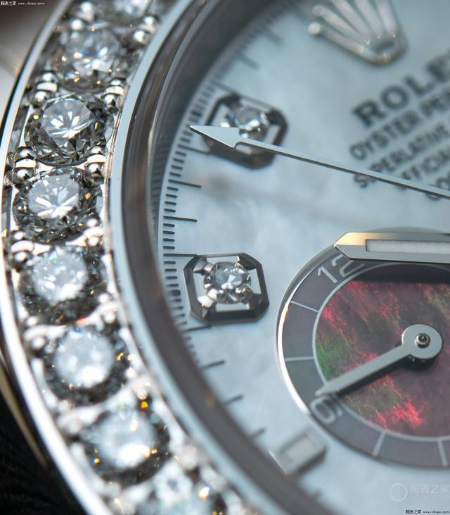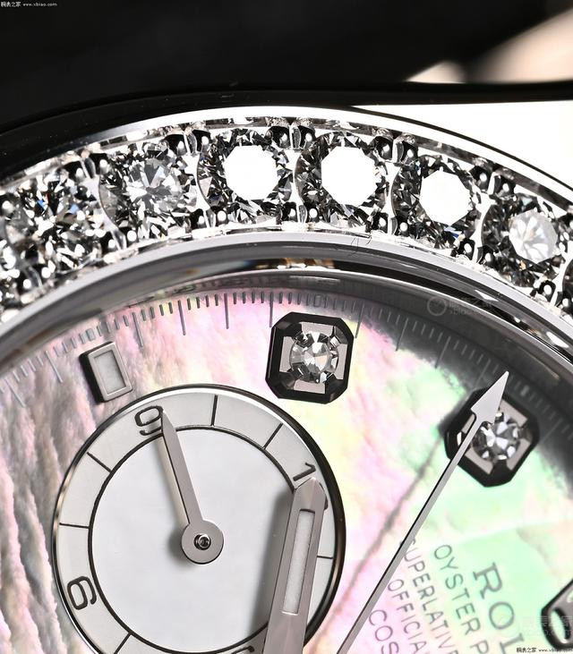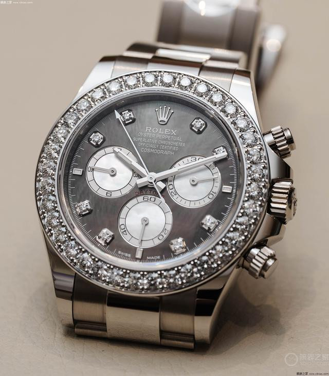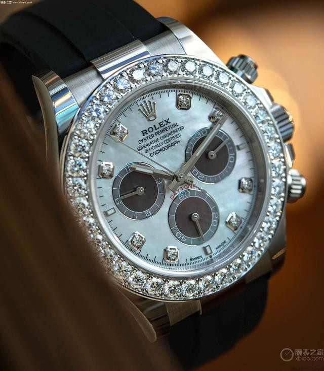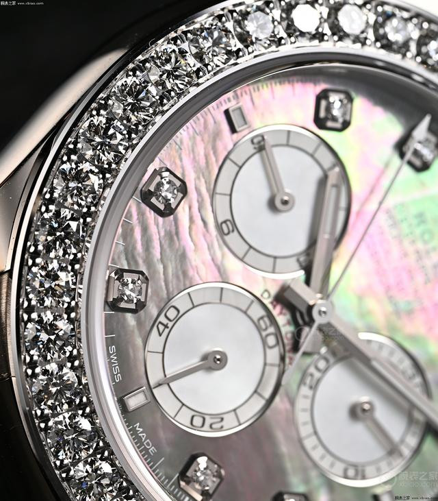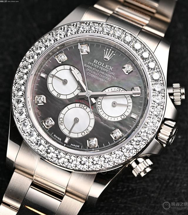 劳力士迪通拿新款珍珠母贝镶钻款,金链款和胶带款。 这两只“珠宝款”迪通拿,同样都是表圈镶嵌36颗钻石(圆钻)、盘面8个包钻,两只表的区别在于,金链款配的是深色母贝盘,胶带款配的是浅色母贝盘。虽然在劳力士迪通拿的阵容中,还存在价值更高的“方钻表圈、条钻时标”的型号,但这两只表的“珍珠母贝盘面”是其他在售迪通拿都没有的。钻石加上珍珠母贝的绚丽效果,非常顶。