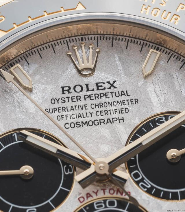 劳力士迪通拿,新款陨石盘。 劳力士在2021年曾推出过一批“陨石盘面”迪通拿,现在迪通拿已经更新换代,新一代的“陨石盘”它这不就来了。新款迪通拿“陨石盘”,全部都是陶瓷圈、胶带款,老款中的金圈金链款,现在被取消。劳力士陨石表盘,这一片陨石的成分主要是91.8%的铁、7.7%的镍。在做成表盘时,需要切割成0.1毫米的薄片,然后进行抛光、酸洗,形成图案,再上漆。陨石盘的稀少、花纹,都增加了迪通拿的价值。