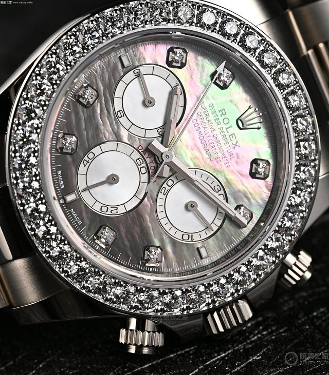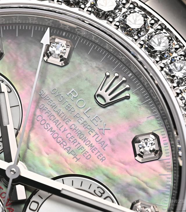 珍珠母贝盘面,以及钻圈钻刻细节 劳力士一向是给运动表镶嵌“钻石、宝石”的大师。远了不说,就近些年的“彩虹迪”、“老虎迪”,都是热门“炒货”。这两只2024年的珍珠母贝“珠宝款”,作为最新款,行情会略微上扬,但目前比较理性,实际价格在公价上下,不存在热炒的情况。
