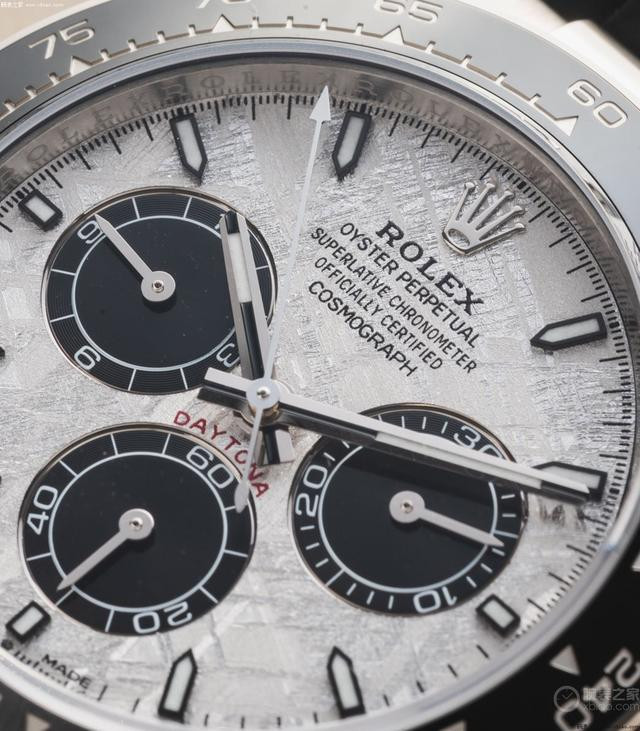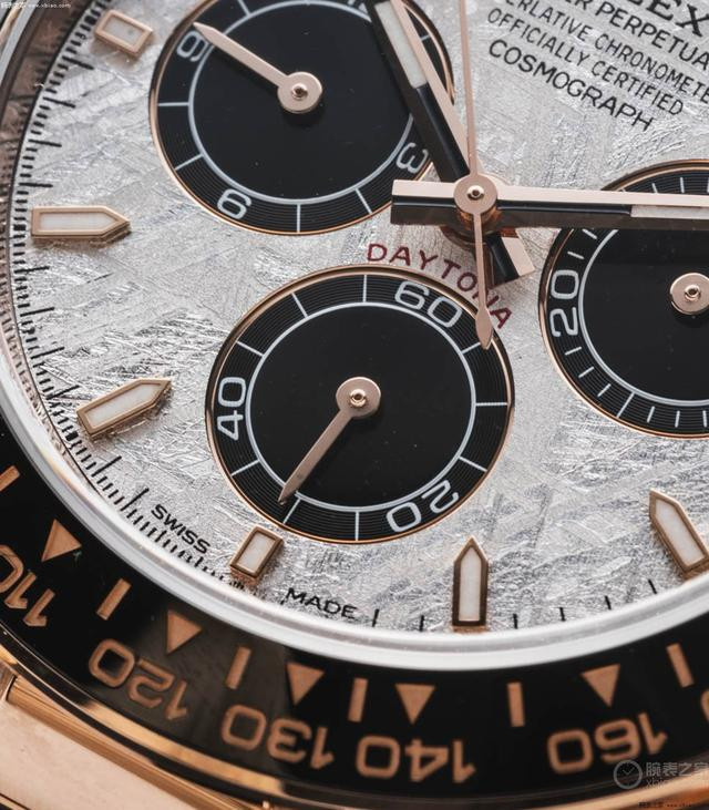 陨石盘细节。 同时新款“陨石盘”迪通拿,也展现出了新一代迪通拿的标志性特点。我们可以看到,手表盘面时标,是新一代的“细长炮弹时标”(老款时标比较短粗);手表陶瓷圈的边缘,有“金属包边”,金属材质和表壳一致。当然,新款“陨石盘”迪通拿,也换装了新型4131自动计时机芯。